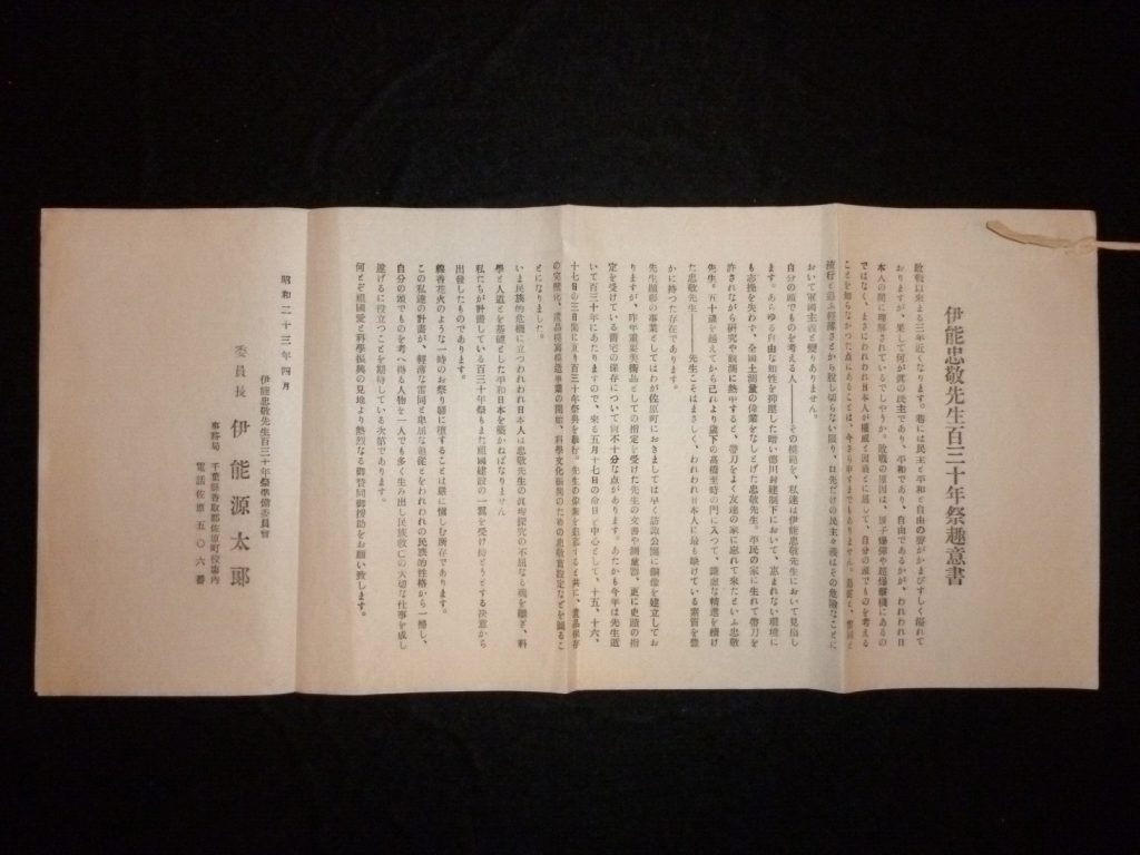 戦後の民主化が進むなかで、昭和23年、忠敬翁百三十年祭が催されました。