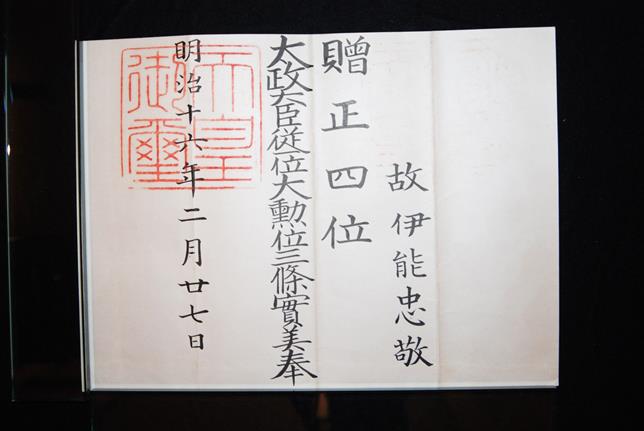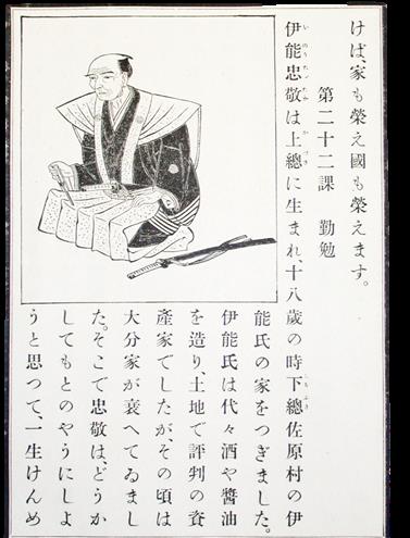 しかし、明治時代になると、忠敬翁は多くの人びとによく知られる人物になりました。その始まりは、大須賀庸之助香取郡長ら地域の人びとが明治政府に働きかけ、伊能図の有用性が認められ、それを作った人物として評価され、明治16年2月27日、「正四位」の位が与えられました。これによって、忠敬翁は「国家的偉人」として認定され、その後、「修身」の国定教科書にも取りあげられ、忠敬翁は偉人として全国的に著名な人物となりました。その人間像は「勤勉」の象徴とされ、「精神一到何事カ成ラザラン」とその徳目が強調されました。